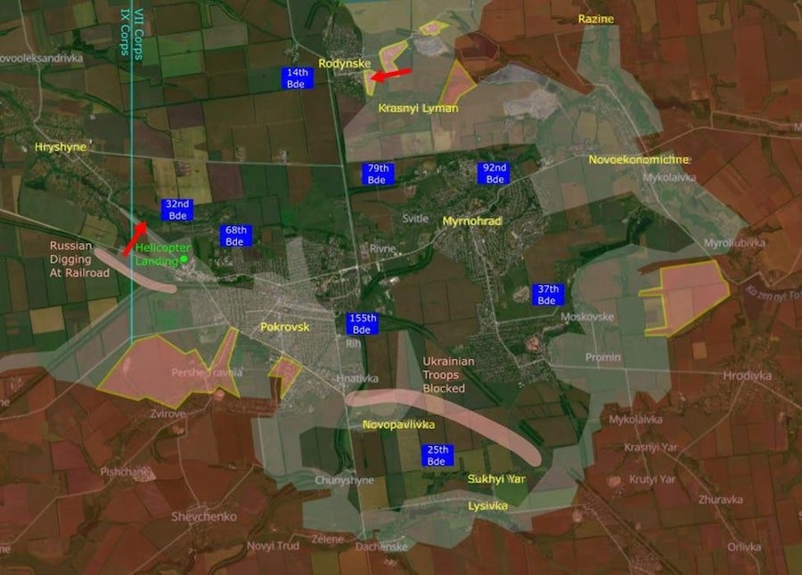 32-га механізована бригада захищала західну сторону Покровська, яка є межею зон відповідальності IX корпусу (Гришине та захід) та VII корпусу (Покровськ). Росіяни проникають через їхні позиції з середини вересня, і командир не повідомив сусідні підрозділи чи вище командування про проникнення. Позиції підрозділу розвалилися під зростаючим тиском, і його командира було звільнено минулого тижня. Залізниця була ключовим елементом місцевості для оборони України. Тепер росіяни окупують її та окопаються. Ця позиція полегшить їм атаку на північ та розширення на захід. Вони вже намагаються захопити ділянку лісу між Гришиним та Покровськом.