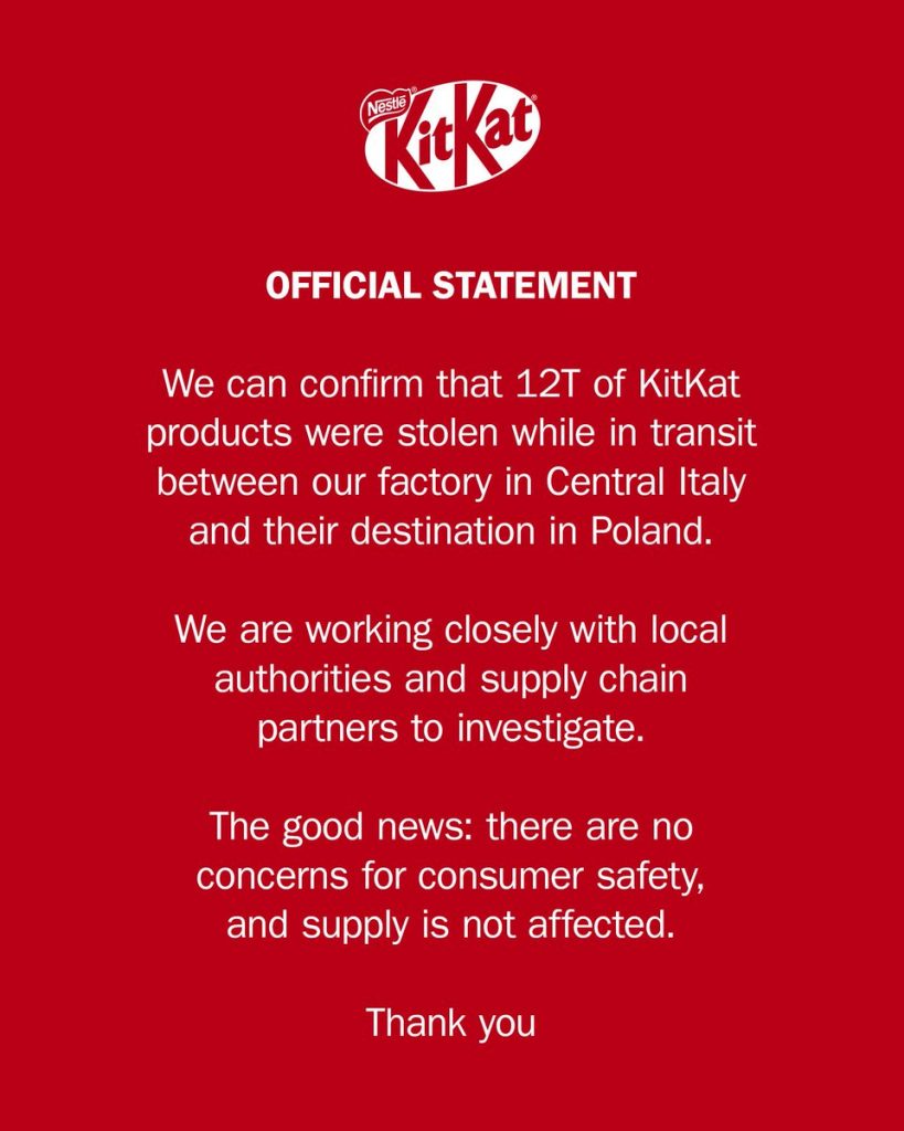 Значну партію шоколадних батончиків Nestlé KitKat було викрадено в Європі, поки ласощі перевозилися з Італії до Польщі. Окрім дефіциту, який могло спричинити пограбування – особливо безпосередньо перед Великоднем – інтернет просто вибухає…